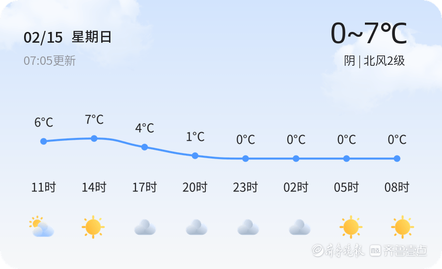 今日是2月15日,星期日,农历十二月廿八。青岛市今天以阴天为主,整体气温温和,白天气温在0℃到7℃之间。各区天气略有差异,但均以阴天为主,风力较小,北风2级,相对湿度85%。