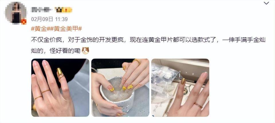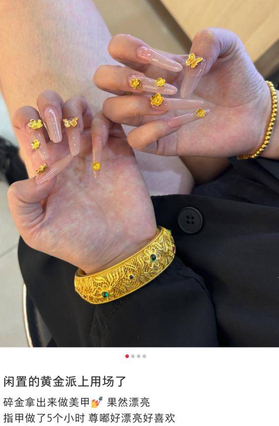 “年终奖发了,给自己做个999黄金美甲”“才做完用了10克”“闲置的黄金派上用场了”⋯⋯