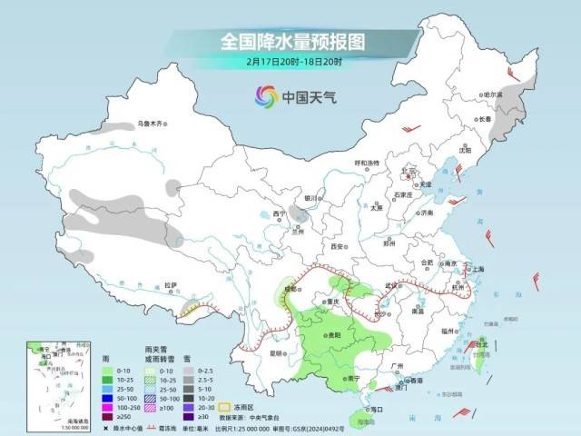 降水方面, 明天中东部地区的降水范围仍然较广,但整体呈现出减弱的趋势。预计,西南地区东部到江南等地普遍有小到中雨,湖北北部、安徽中部等地有雨夹雪,湖南、贵州局地还会有冻雨。