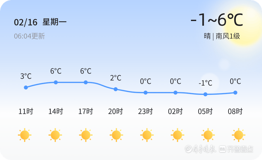今天是2月16日,农历十二月廿九,泰安市迎来了一天的晴朗天气。当前气温为-3.4℃,天气状况为晴,南风1级,空气湿度42%,PM2.5指数31,空气质量良好。今日全市各区天气情况一致,均为晴天,白天气温最高可达6℃,夜间最低气温为-1℃。