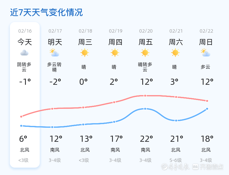 明天(2月17日),聊城天气将转为多云转晴,温度有所回升,预计最低气温-2℃,最高气温12℃,北风转南风,风力3-4级。相较于今天,明天的气温稍有上升,风力有所增强,市民外出需注意防风保暖。