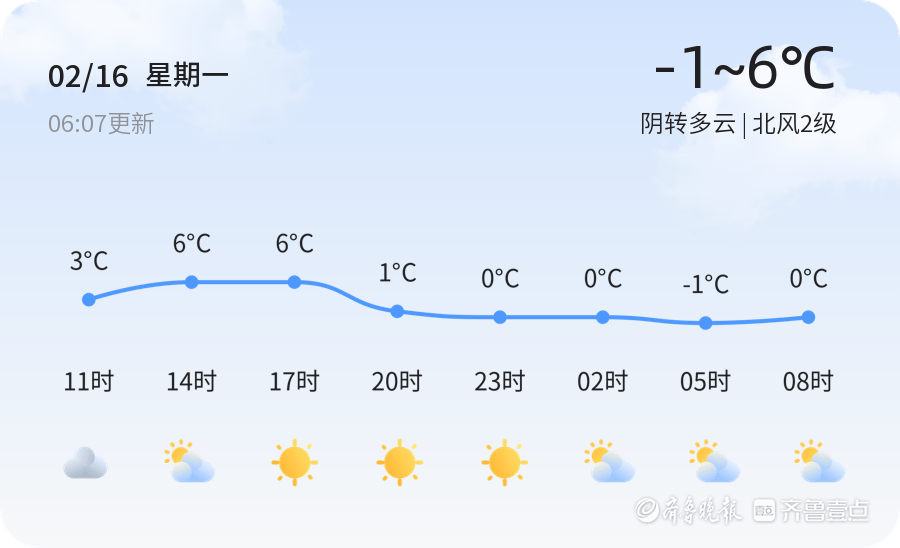 今天是2026年2月16日,星期一,农历十二月廿九。聊城地区今天天气为阴转多云,温度范围在-1℃到6℃之间,北风2级,空气湿度39%,PM2.5指数为44。各区天气情况基本一致,均为阴转多云,温度适中,风力较小,适合外出活动。