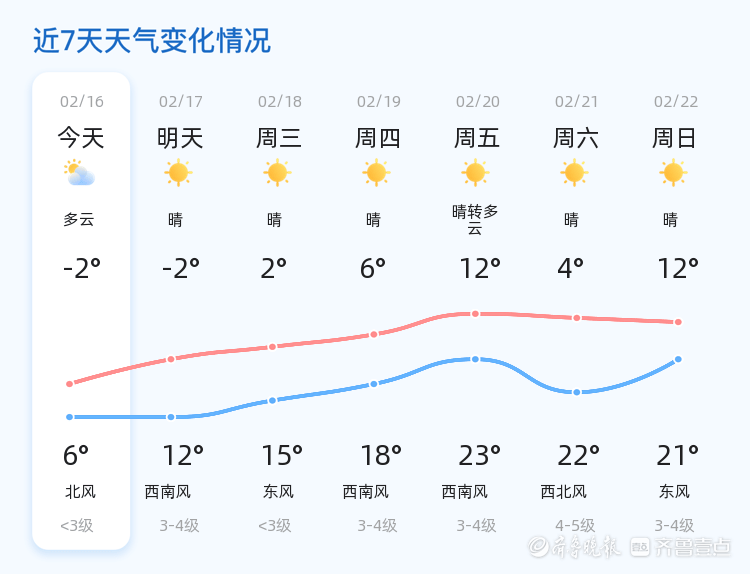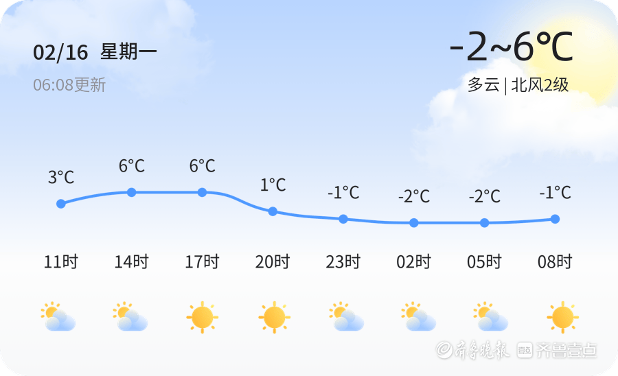 今日是2026年2月16日,农历十二月廿九,星期一。菏泽市,气温介于-2℃至6℃之间,北风2级。全市各区天气情况基本一致,均为多云,风力较小,空气质量良好,PM2.5指数为50,适合户外活动。目前温度为-1.2℃,空气湿度40%,市民出行请注意保暖。 明日天气将转为晴朗,气温较今日有所上升,最低气温仍为-2℃,最高气温将升至12℃。风向转为西南风,风力3-4级,较今日有所增强。市民明日出行时,需注意防风保暖。 未来三天,菏泽市天气趋势为持续晴朗,气温逐渐升高,最高气温将达到15℃。周三和周四天气晴朗,风力较小,适宜户外活动;周五天气晴转多云,气温将进一步升高至23℃。周末天气晴朗,气温略有下降,但整体仍较为温暖。市民需注意防晒,同时密切关注风力变化,防范大风对出行和生活的影响。 温馨提示