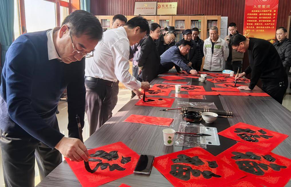 刚走进村部大厅,墨香伴着欢笑声,迎面扑来。二楼的农家书屋挤了个满满当当,来自梨树县文联、县书法家协会的志愿者挥毫泼墨,围在外圈的村民个个翘首期待。