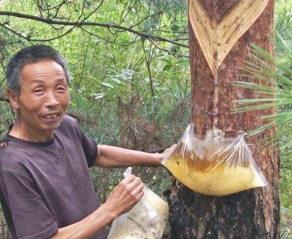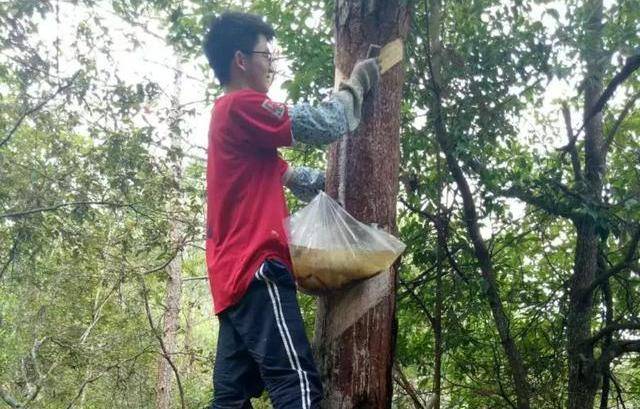 小海这个工作说轻松也轻松,说麻烦也麻烦,主要就是在松树林中将选定要割油的松树,用松油刀在离地80公分左右的树干上切一圈倾斜的口子,将预留接松油的塑料袋挂在松树干切出口子最低的一侧,做好引流,让松树干分泌的松油顺利地流进塑料袋中,过几天再拿着大麻袋来统一收取这些悬挂在松树干上的塑料袋,扛到山下储存,等待收购商上门装车就行了。整个流程看上去既简单,技术含量也不高,人人都能干得好,其实它也是既挑人,又有更高发展前途的职业!
