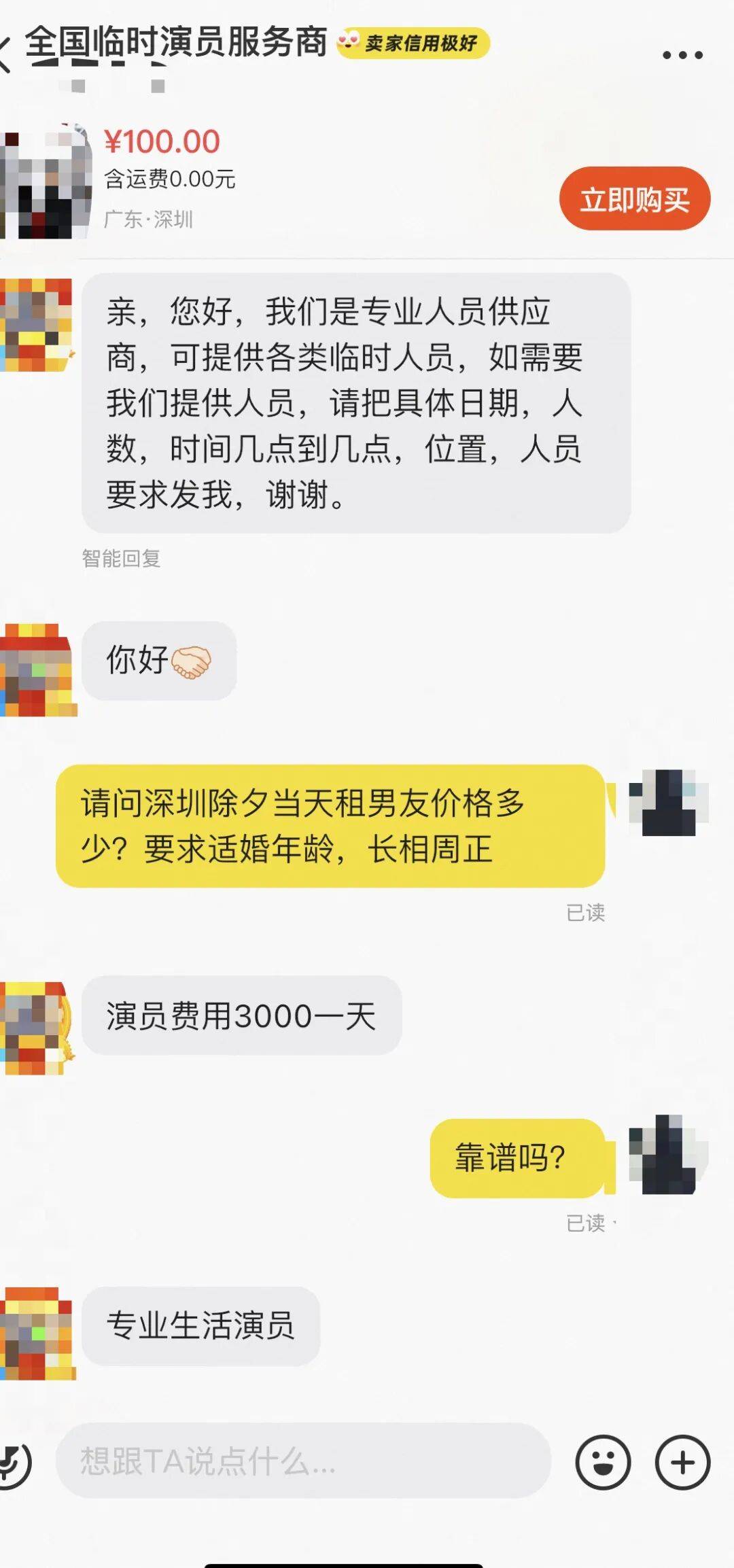 记者以消费者身份在某二手交易平台联系了一位商家,在简单说明“需求”后,对方很快回复:“3000元一天”,并强调都是专业的“生活演员”。