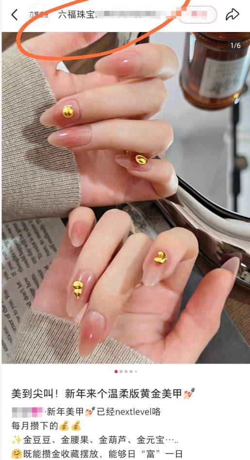 六福珠宝、周六福等品牌店铺的店员,也将金饰用于美甲“宣传”,在社交媒体进行营销。
