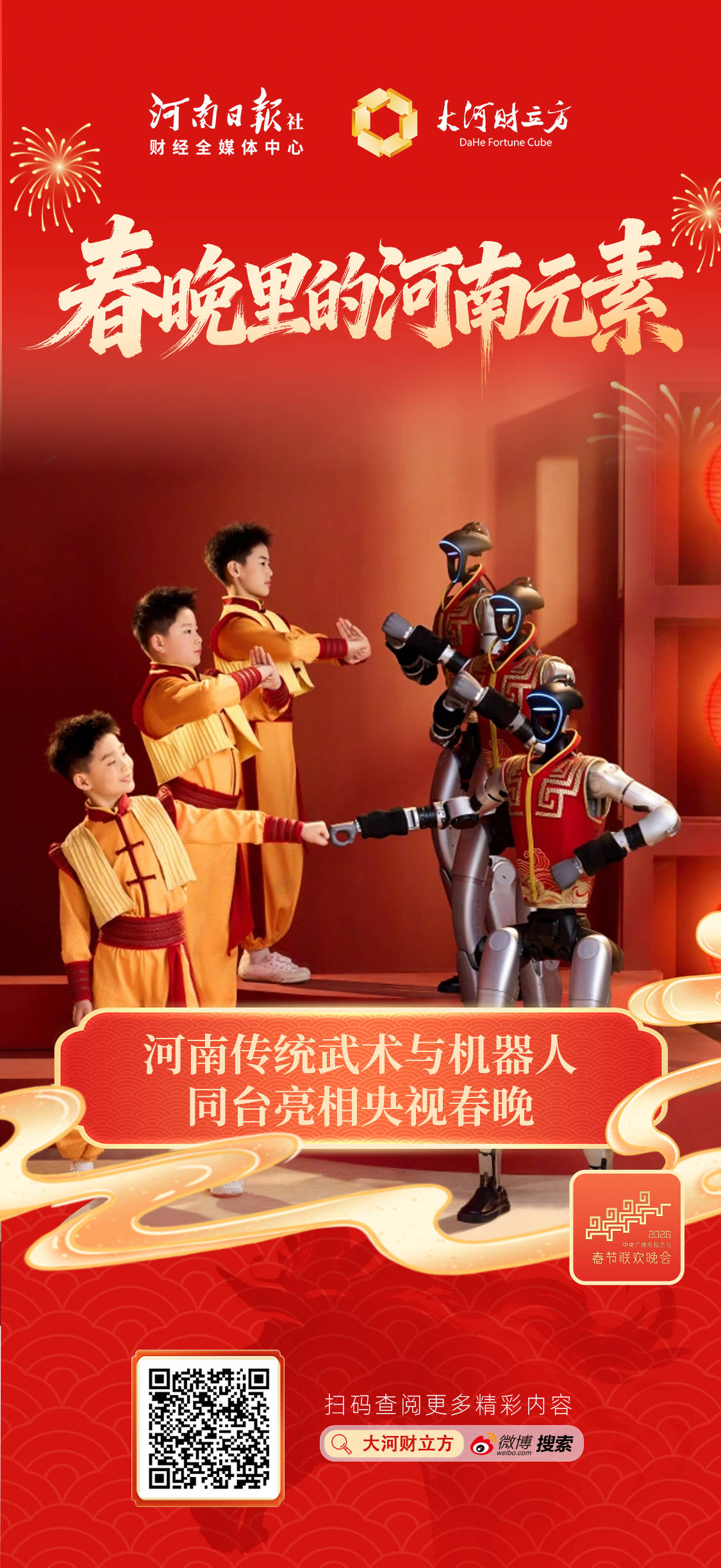 【大河财立方 记者 王宇】2月16日,在2026年央视春晚上,宇树科技机器人携手河南塔沟武术学校带来创意武术节目《武 BOT》。节目中,宇树科技人形机器人与武术少年同步出招,踢腿、拳法、棍法刚劲利落,精准动作尽显中国功夫气势。据了解,这场表演是塔沟武校第23次登上央视春晚舞台,让河南传统武术与前沿科技在国家级舞台上交相辉映。