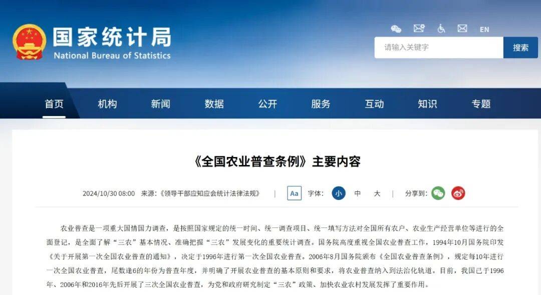 农业普查是一项重大国情国力调查,是按照国家规定的统一时间、统一调查项目、统一填写方法对全国所有农户、农业生产经营单位等进行的全面登记,是全面了解“三农”基本情况、准确把握“三农”发展变化的重要统计调查。国务院高度重视全国农业普查工作,1994年10月国务院印发《关于开展第一次全国农业普查的通知》,决定于1996年进行第一次全国农业普查。2006年8月国务院颁布《全国农业普查条例》,规定每10年进行一次全国农业普查,尾数逢6的年份为普查年度,并明确了开展农业普查的基本原则和要求,将农业普查纳入到法治化轨道。目前,我国已于1996年、2006年和2016年先后开展了三次全国农业普查,为党和政府研究制定“三农”政策、加快农业农村发展发挥了重要作用。