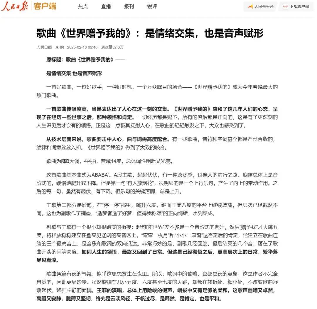 《人民日报》刊发乐评人李皖的文章,称这首歌“应和了这几年人们的心态,呈现了在经历一些世事之后,那种领悟和肯定”。