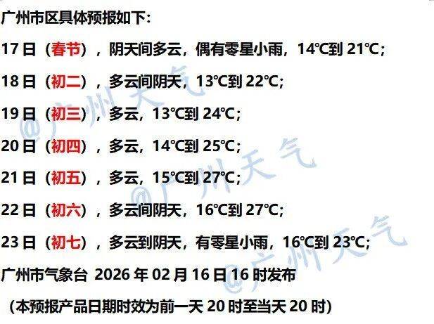 广州市气象台预计,中等强度冷空气16日夜间抵穗,受其影响年初一至初二,广州阴天间多云,日平均气温下降4~6℃,最高气温21~22℃,最低气温:北部10~12℃(山区7~10℃)、中部12~13℃、南部13~15℃,陆地风力增大到3~5级,港区5~7级。初三至初六多云为主,气温逐渐回升;初七受新一股冷空气影响,气温小幅下降,有零星小雨。