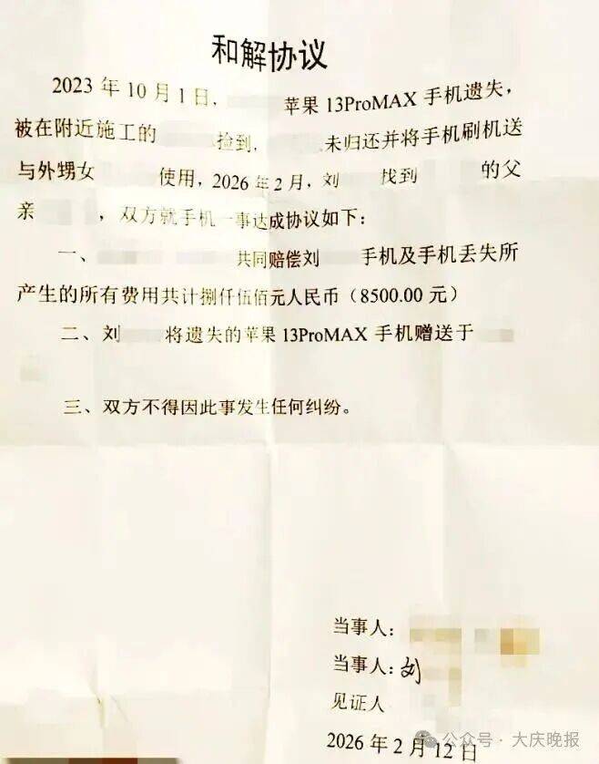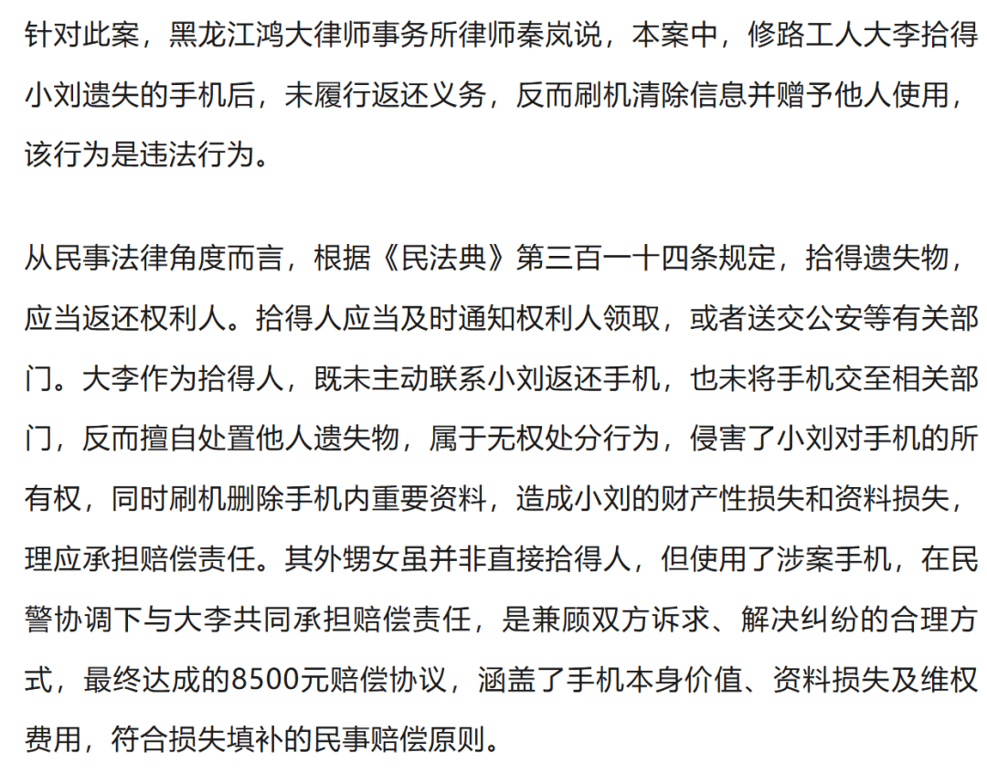 经李鹏飞协调,兼顾双方合理诉求。最终,大李及其外甥女的家人向小刘支付8500元作为补偿,这笔款项包含手机本身的价值6000元、被删除资料的补偿2000元,还有小刘寻找手机所产生的费用500元,双方就此达成和解。