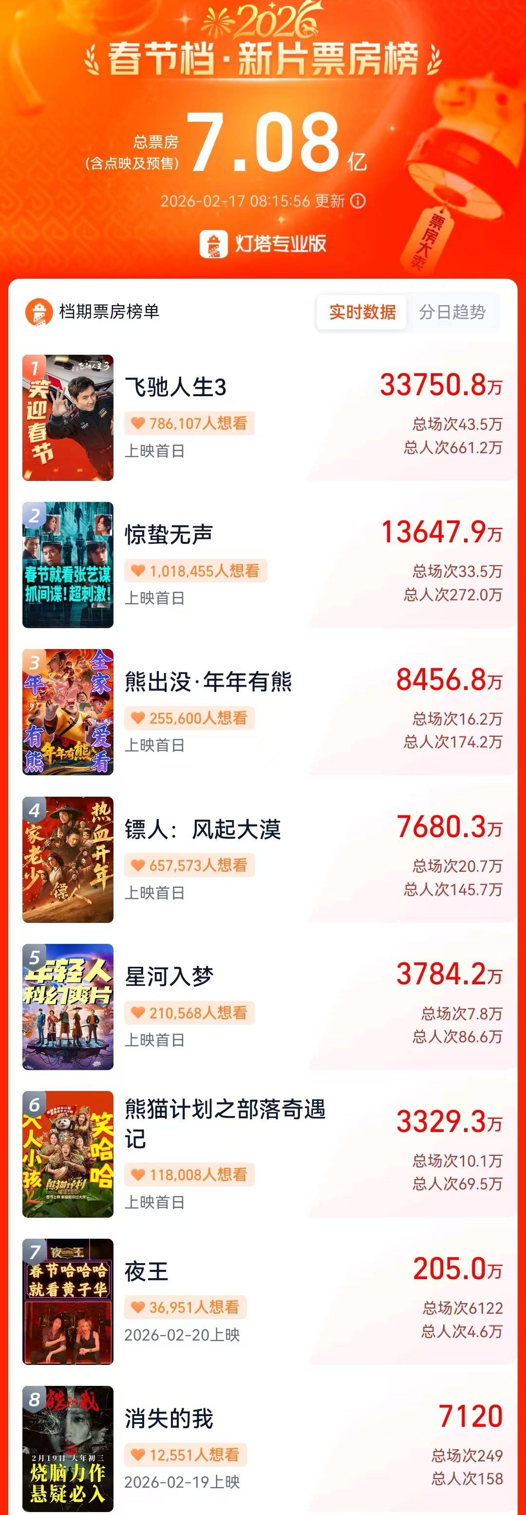 大年初一预售票房6亿元,《飞驰人生3》《惊蛰无声》《镖人》《熊出没·年年有熊》《熊猫计划之部落奇遇记》《星河入梦》预排片占比各30%、26.7%、16.8%、11.1%、8%、7.3%,《飞驰人生3》《熊出没·年年有熊》上座率领先。