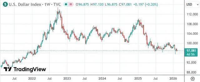 截至发稿,美元指数报97.08,年初至今已累计下跌约1.2%,2025年这一货币已大跌超9.4%。上月,美元指数一度跌至95.51,为四年来的最低水平。