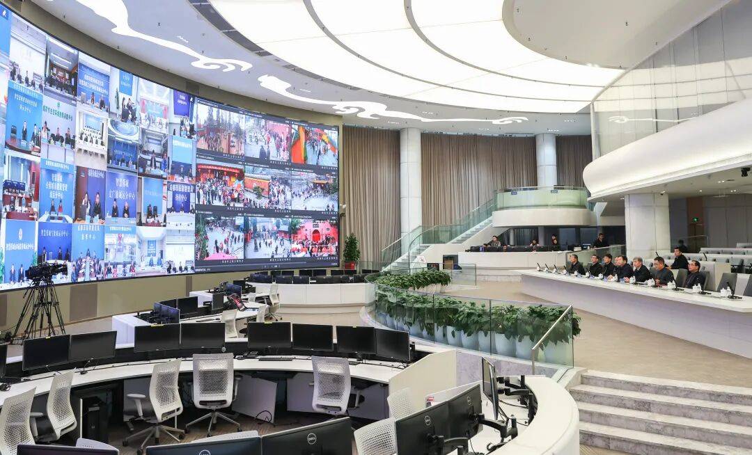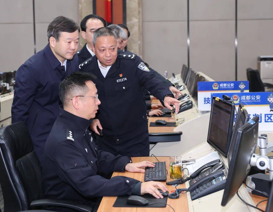 在成都市公安局应急联动指挥中心察看城市交通路网运行、重要点位值班值守等情况,详细了解社会面治安管控、重点景区秩序维护、交通疏导保畅等方面情况