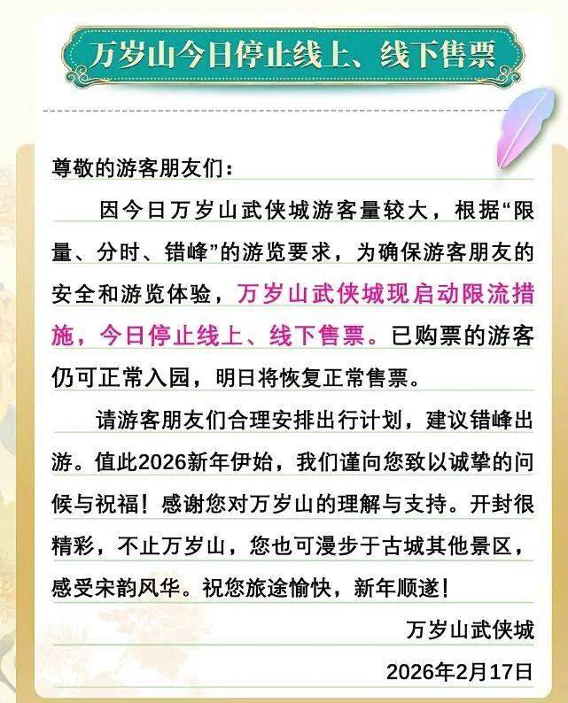 因今日万岁山武侠城游客量较大,根据限量、分时、错峰的游览要求,为确保游客朋友的安全和游览体验,万岁山武侠城现启动限流措施,今日停止线上、线下售票。已购票的游客仍可正常入园,明日将恢复正常售票。