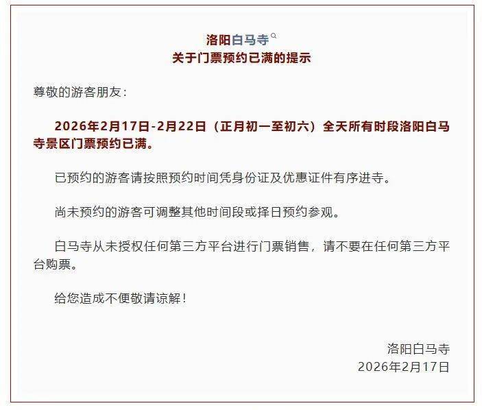 2026年2月17日-2月22日(正月初一至初六)全天所有时段洛阳白马寺景区门票预约已满。已预约的游客请按照预约时间凭身份证及优惠证件有序进寺。尚未预约的游客可调整其他时间段或择日预约参观。