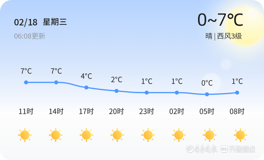 今天是2026年2月18日,星期三,农历正月初二。今日迎来二十四节气中的第二个节气——雨水。雨水节气标志着冬季结束,春季开始,气温逐渐回升,降水增多。今日日照市天气晴朗,气温在0℃至7℃之间,西风3级,空气湿度42%。各区天气情况基本一致,均为晴朗天气。市民可以趁着晴好天气,享受春日的温暖阳光。