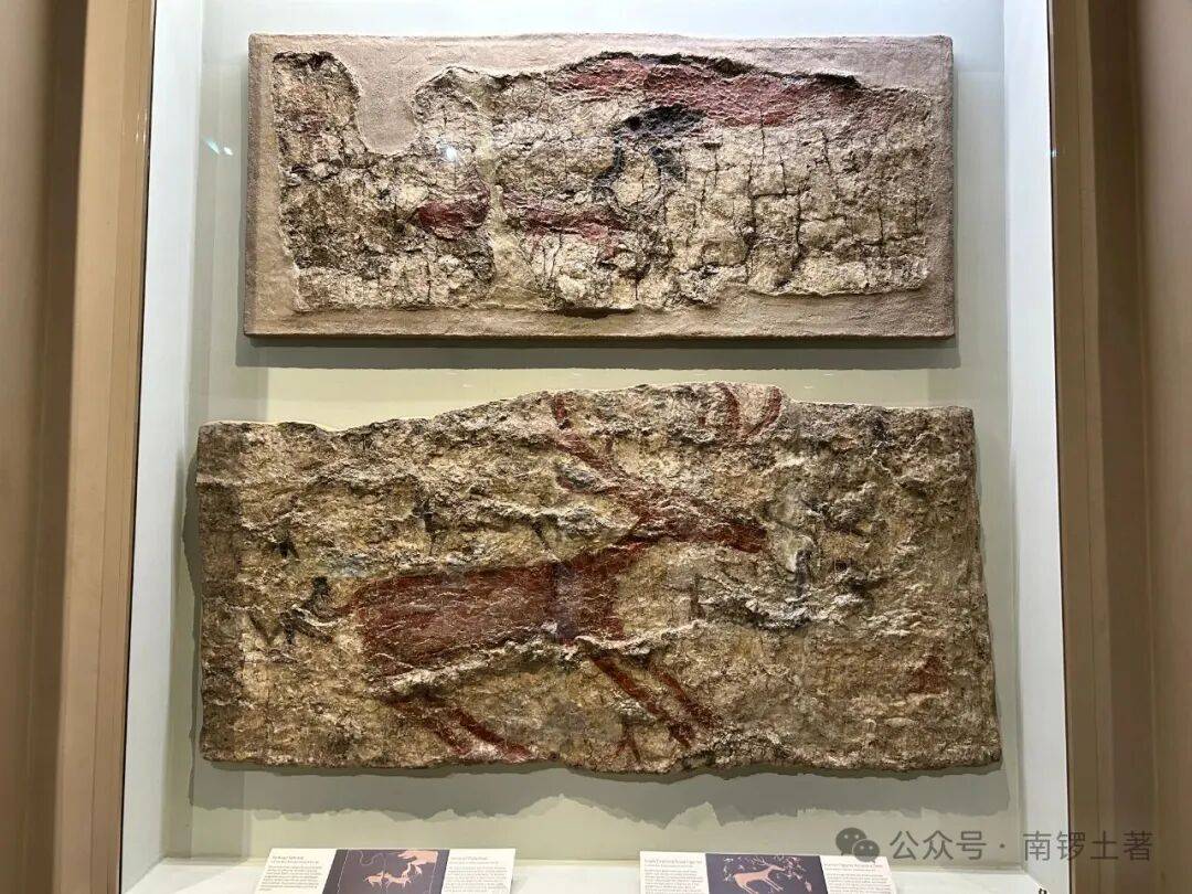 恰塔霍裕克遗址出土的新石器时代壁画,是颜料绘于泥砖墙面后脱落的残片,年代约为公元前6000年的新石器时代晚期,恰塔霍裕克是世界最早的大型定居点之一。下方残片清晰绘有鹿,上方残片是抽象图案。恰塔霍裕克的壁画常以动物、狩猎、仪式场景为主题,动物形象,尤其是鹿、公牛,象征自然丰饶、生命循环,是当时定居农业社会的信仰符号之一。这是人类早期定居文明艺术与精神生活的直接见证,反映了新石器时代安纳托利亚地区的审美与信仰,也是世界上最早的壁画遗存之一。