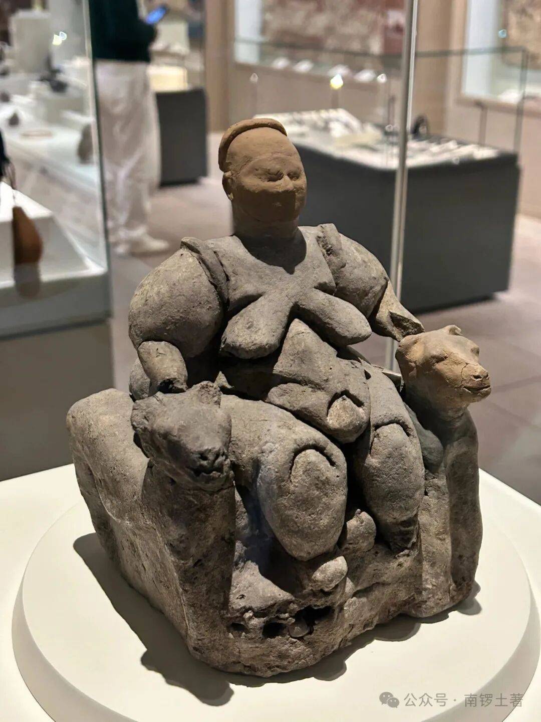 恰塔霍裕克(Çatalhöyük)的坐像女性陶塑,公元前5750年,是新石器时代的重要文物。1961年由考古学家在土耳其恰塔霍裕克遗址发现,原作头部和右手部分残缺,现在的头部是修复的。雕塑呈现丰腴的女性坐姿,双腿间有类似新生儿的造型,被普遍认为是“大地之母/生育女神”的崇拜,象征人类繁衍与农业丰收。两侧的豹头造型扶手被认为是代表女神的权威与对族群的保护。这是史前“母神崇拜”的典型代表之一,反映了当时社会对“生育、丰饶”的信仰,也是人类早期定居文明的精神生活见证。