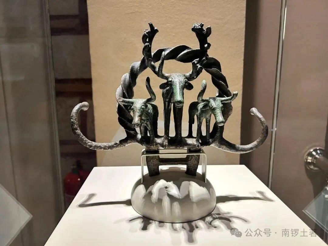 出土于阿拉卡霍裕克王室墓葬的“公牛青铜礼仪顶饰”,公元前2500~前2250年,哈提亚文明文物,青铜材质的礼仪器具,是该遗址出土的20余件“青铜礼仪顶饰”之一。主体是1头主公牛+2头幼牛的组合,周围环绕着扭结的装饰带,两侧延伸出夸张的长弯角。公牛是哈提亚文明的神圣动物,与丰饶、力量与王权相关,这种多牛组合象征族群繁衍、牲畜兴旺,是农业、畜牧业社会的核心信仰符号。作为礼仪用器,推测固定在木杆或车辆上用于祭祀。