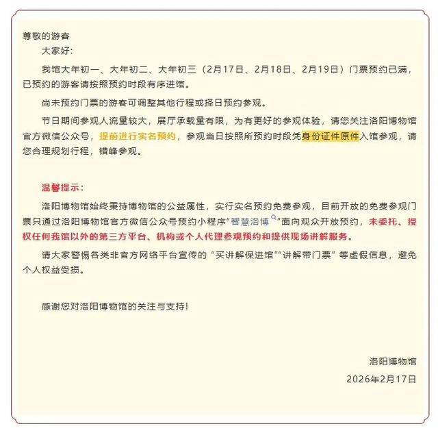 洛阳博物馆2月18日、2月19日门票预约已满,已预约的游客请按照预约时段有序进馆。尚未预约门票的游客可调整其他行程或择日预约参观。