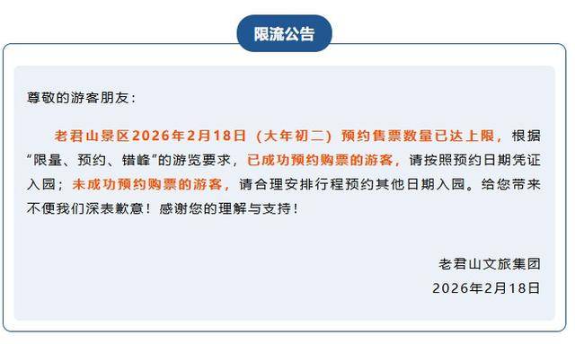 老君山景区2026年2月18日(大年初二)预约售票数量已达上限。已成功预约购票的游客,请按照预约日期凭证入园;未成功预约购票的游客,请合理安排行程预约其他日期入园。