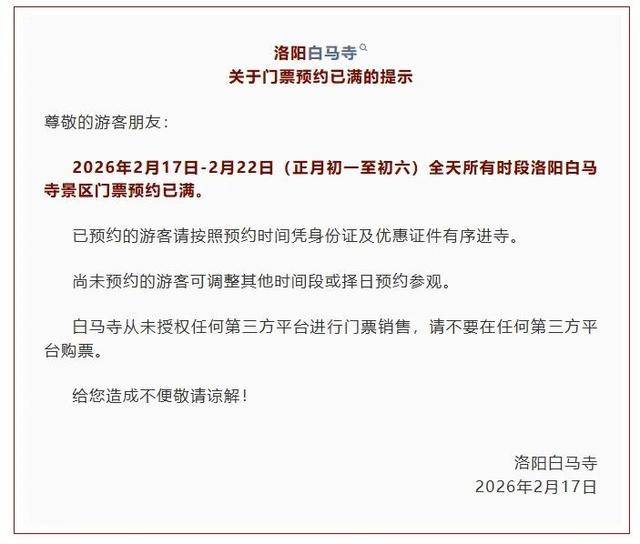 2月17日至2月22日(正月初一至初六)全天所有时段洛阳白马寺景区门票预约已满。已预约的游客请按照预约时间凭身份证及优惠证件有序进寺。尚未预约的游客可调整其他时间段或择日预约参观。