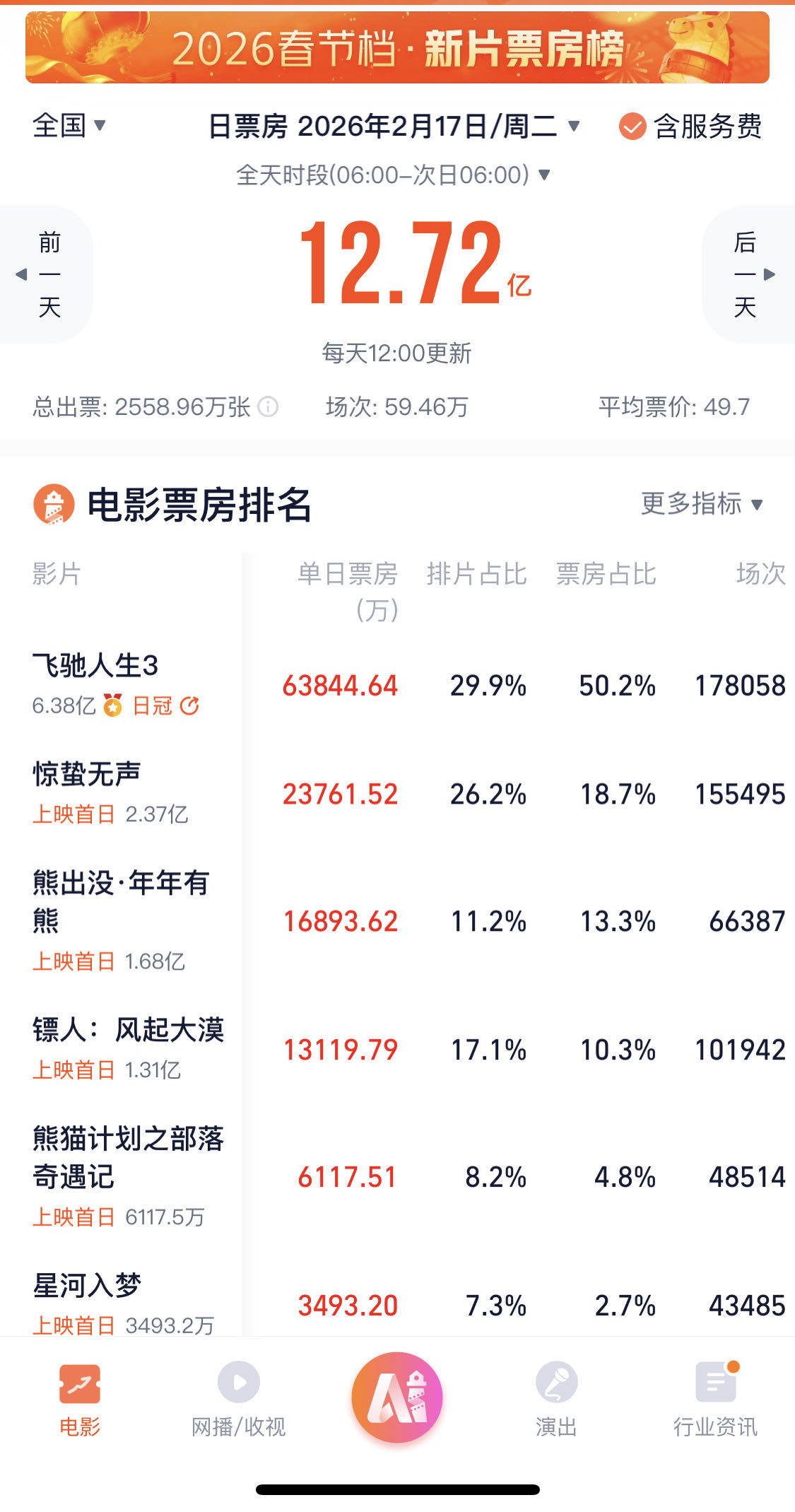 影片上映两日,市场表现堪称“断层领先”。大年初一上映首日,春节档大盘单日票房突破12.72亿,刷新中国影史大年初一单日场次数纪录,而《飞驰人生3》以单日超6.38亿的票房、超1265万的观影人次,毫无悬念拿下首日票房冠军,用不足30%的排片,撬动超大盘过半比重的票房。