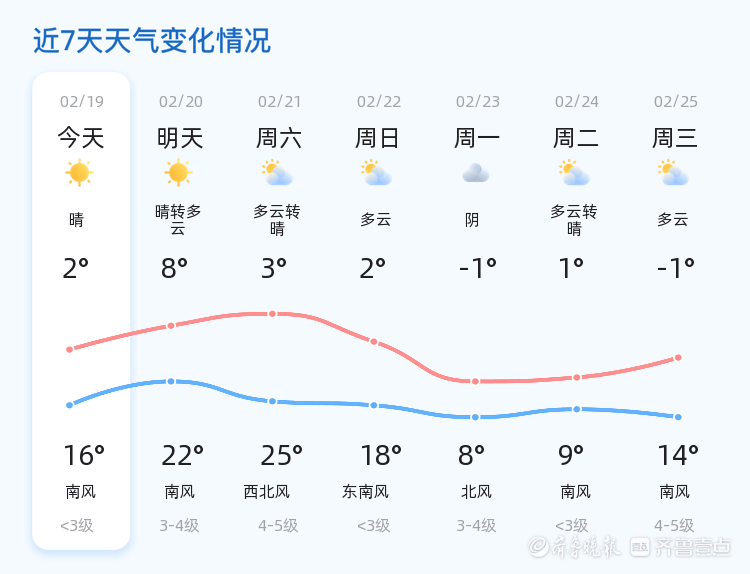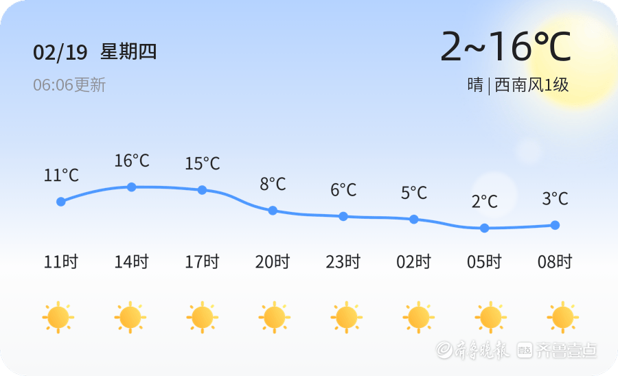 今天是2月19日,农历正月初三,聊城市迎来晴朗天气,气温在2℃至16℃之间。全市各区均以晴朗天气为主,南风风力较小,空气湿度适中。