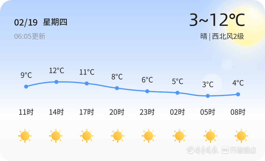 2月19日(正月初三)是星期四,今日日照天气晴朗,气温在3℃到12℃之间,西北风2级,空气湿度较高,达到92%。PM2.5指数为84,空气质量良好,适合市民外出活动。目前温度较低,市民出行时请注意保暖,建议穿着防风外套和保暖衣物,同时由于湿度较大,可能会有轻微的雾气,驾车请注意安全,保持车距,减速慢行。