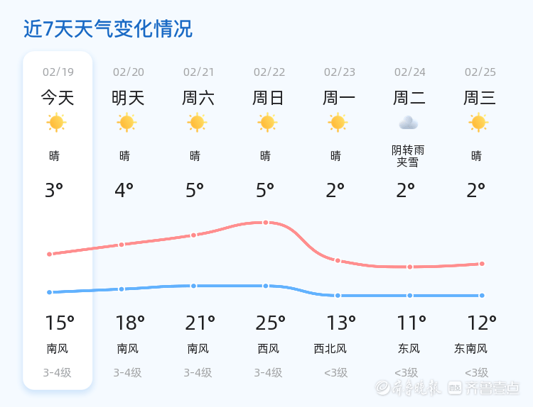 未来三天,淄博市将持续晴朗天气,气温逐渐升高,预计到2月22日(周日)最高气温可达25℃。然而,2月24日(周二)将迎来雨夹雪天气,气温有所下降,最低气温为2℃,最高气温为11℃。市民朋友们需关注天气变化,及时增添衣物,雨雪天气出行请注意交通安全,随身携带雨具。