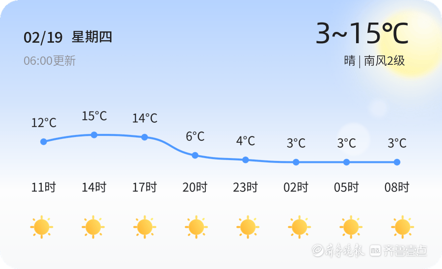 明天2月20日,淄博市仍将维持晴朗天气,气温有所上升,最低气温为4℃,最高气温可达18℃。与今日相比,明日气温整体偏高,市民朋友们可以适当减少衣物,但早晚温差较大,仍需注意保暖。