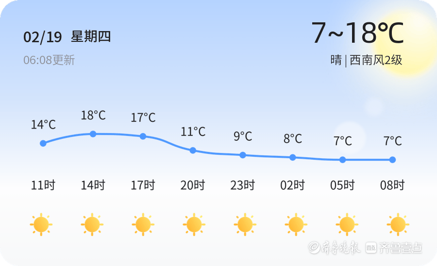 今日是2月19日,正月初三,菏泽市迎来晴朗天气,气温为7.5℃,西南风2级,空气湿度51%,空气质量为轻度污染。预计今天最高气温18℃,最低气温7℃。当前PM2.5指数为114,属于轻度污染,建议敏感人群减少户外活动。出行时请做好保暖措施,随身携带雨具以备不时之需。未来三天天气趋势显示,菏泽市天气将以晴到多云为主,最高气温可达25℃,最低气温为6℃。22日将出现雨夹雪天气,气温骤降,市民需及时增减衣物。提醒市民注意防范雨雪天气对交通的影响,驾驶员请减速慢行,确保行车安全。温馨提示
