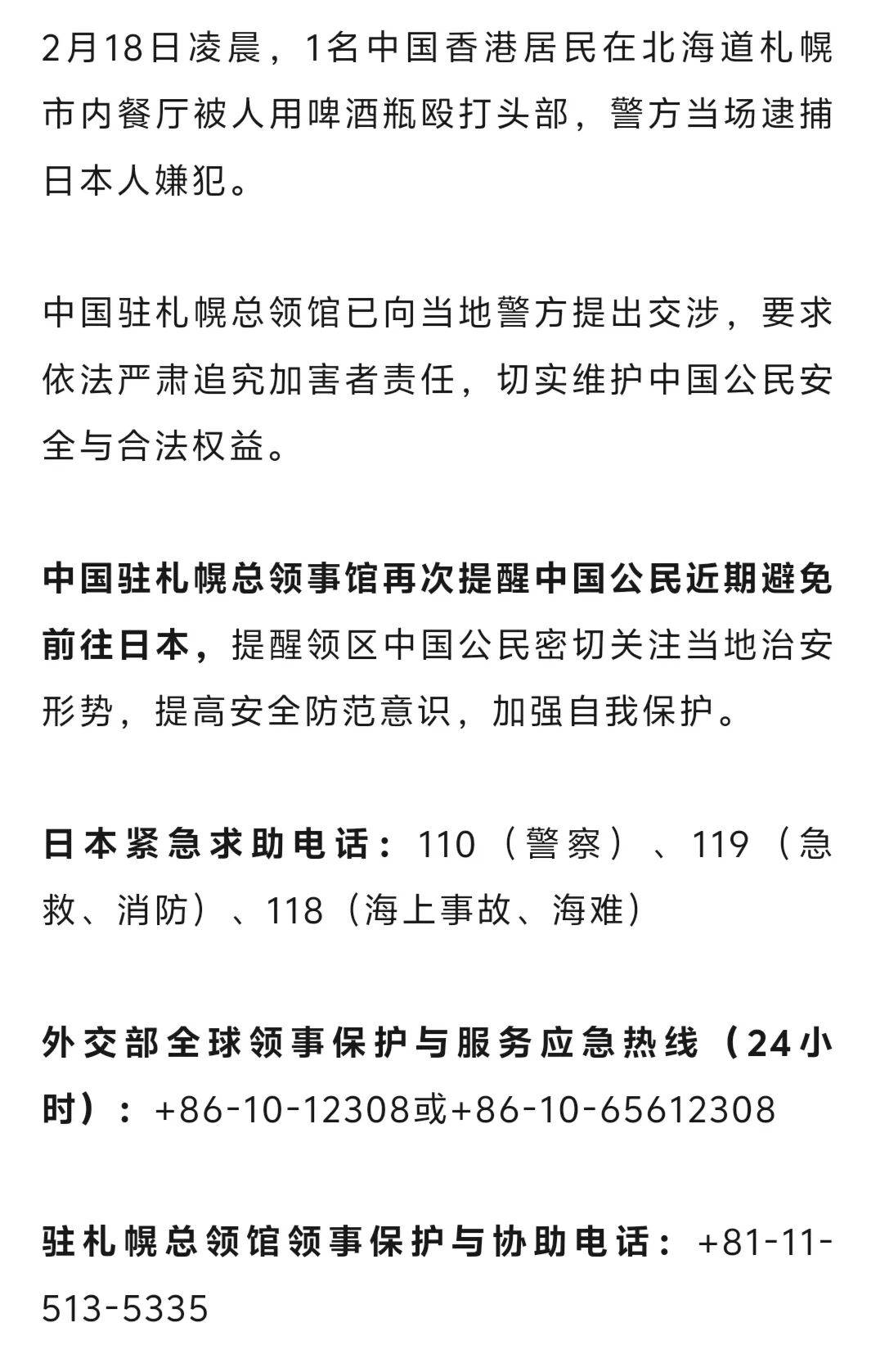 一中国香港居民被日本人用啤酒瓶殴打头部,我总领馆发声
