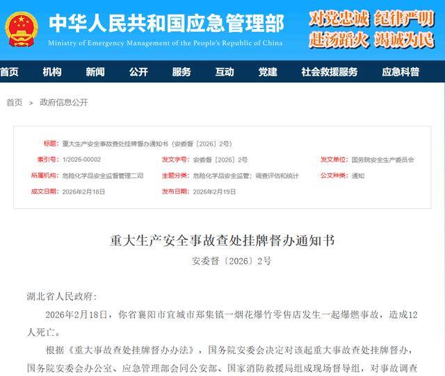 2026年2月18日,你省襄阳市宜城市郑集镇一烟花爆竹零售店发生一起爆燃事故,造成12人死亡。