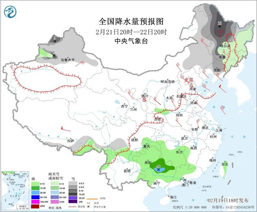 图4 全国降水量预报图(2月20日20时-21日20时)