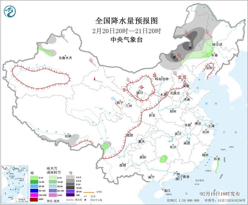 图3 全国降水量预报图(2月19日20时-20日20时)