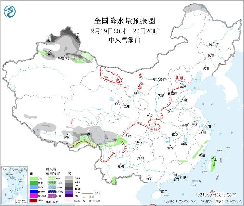 2月19日20时至20日20时,新疆东部和北部、黑龙江西北部、西藏南部和东部、川西高原南部等地部分地区有小到中雪或雨夹雪,其中,新疆北疆北部和北疆东部、西藏东部等地部分地区有大到暴雪,局地大暴雪(20~22毫米)。西藏东南部、云南南部、四川盆地西南部、江西南部、浙江南部、福建中部、台湾岛大部等地部分地区有小雨。新疆北部和东部、内蒙古西部、甘肃河西、宁夏中北部、青海东部和北部、陕西北部等地的部分地区有5~7级风,阵风8~10级(见图3)。新疆东部和南疆盆地、内蒙古西部、甘肃西部、宁夏北部等地的部分地区有扬沙或浮尘天气,局地有沙尘暴。