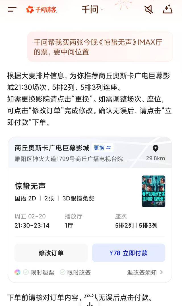 “‘千问帮我买两张今晚《惊蛰无声》IMAX厅的票,要中间位置’,我和发小就这样定好了今天出去玩的安排。”回商丘老家过年的00后小孙分享道。一句口令,选座、比价、支付全部自动完成,让他们能把更多时间留给团聚与闲聊。