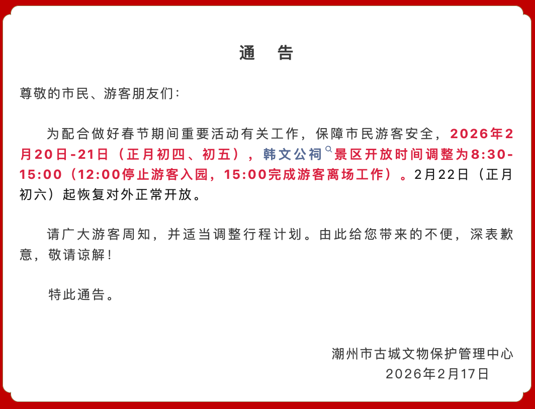 2月17日晚,据广东潮州市文化广电旅游体育局消息,广东潮州市古城文物保护管理中心发布通告称:为配合做好春节期间重要活动有关工作,保障市民游客安全,2026年2月20日-21日(正月初四、初五),韩文公祠景区开放时间调整为8:30-15:00(12:00停止游客入园,15:00完成游客离场工作)。2月22日(正月初六)起恢复对外正常开放。
