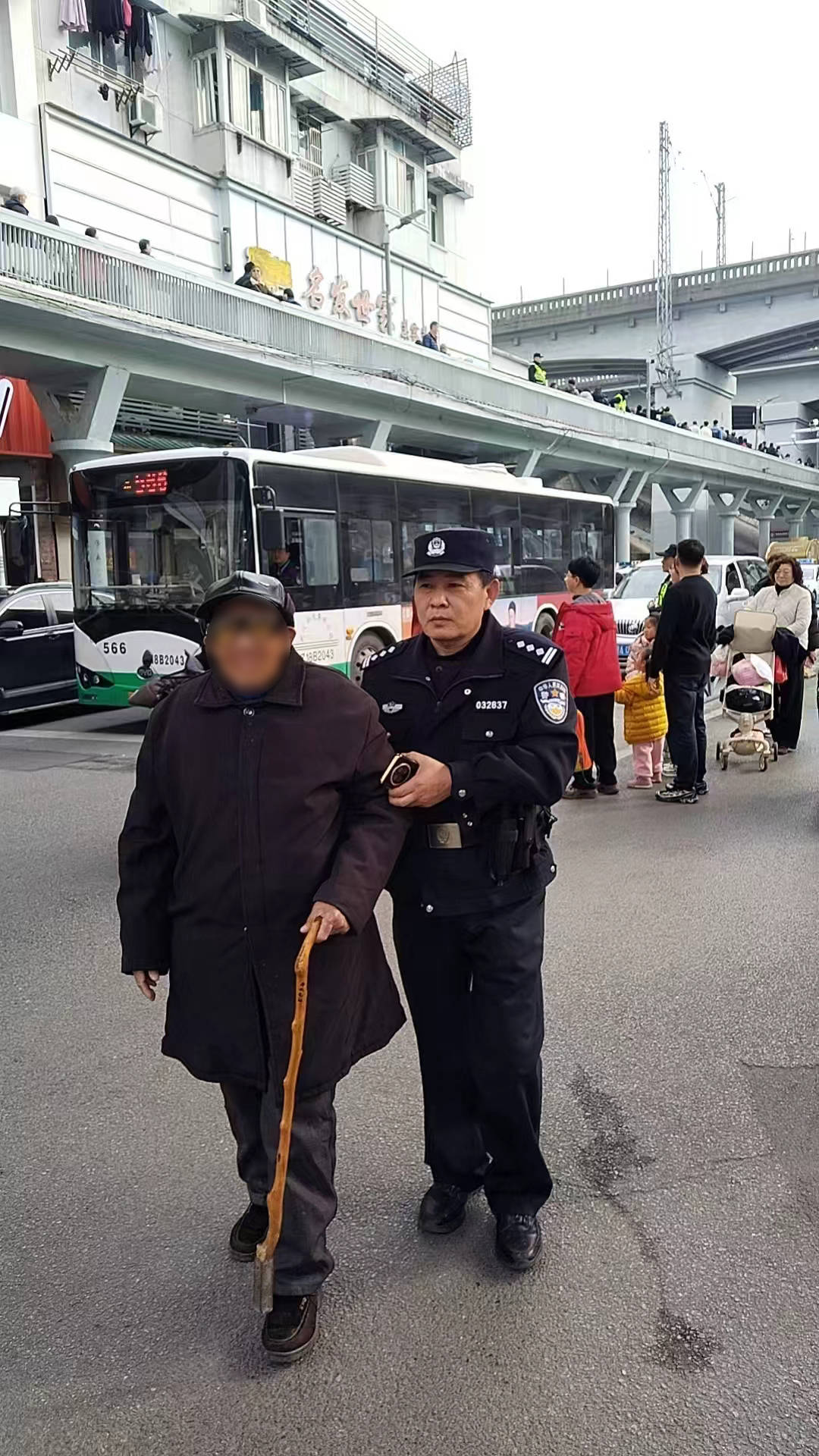 “99岁的老人,拄着拐杖,戴着帽子和老花眼镜。”民警、辅警边找边问。一名店主告诉民警,刚刚见到过这样一位老人,朝黄鹤楼方向走去。民警、辅警立即往黄鹤楼方向寻找,走到司门口天桥附近,发现了正在拄着拐杖行走的陈爹爹。