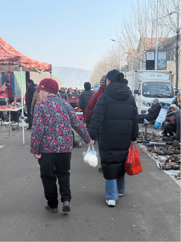 这是今年最后一个年集(农历新年前夕的集市),不像之前、主要买煎饼和馒头,这次要买的东西更多——“要买五天前漏买的芹菜,再买瓶香油给你们拌凉菜,买把勺子,再买橘子和香蕉,其他的,看着添置。”奶奶年纪大了,容易忘事,赶集前得反复念叨几遍。为了多装点儿东西,她没带那只蓝色布包,而是带了一只洗干净的化肥袋子。