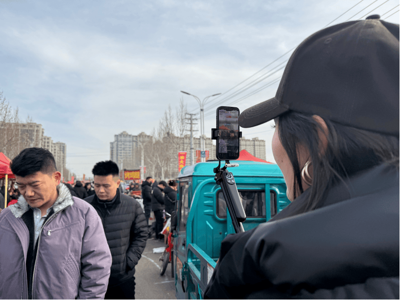 2月16日,农历腊月二十九早上八点左右,临沭县曹洼大集,一位主播正在直播赶集。 新京报记者 赵敏 摄