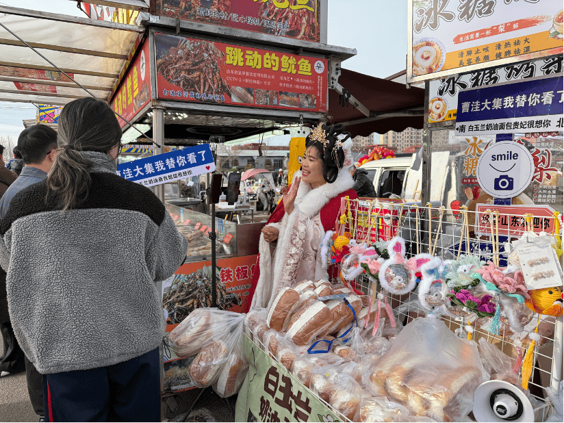 一块钱一个的烤排、一块钱两个的牛肉煎包、十元四个的奶油面包、五块钱一碗的拉面……有博主来这里试验,在大城市只能买到两三杯咖啡的一百元钱,在这里买到的东西根本拎不动。我在媒体报道里看到过一组数据:2025年11月23日,周末,曹洼大集的人流量峰值突破14万人次,交易额超1500万元,被列为商务部“千集万店”改造提升试点项目。