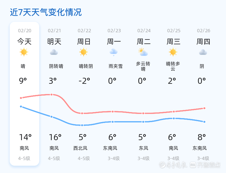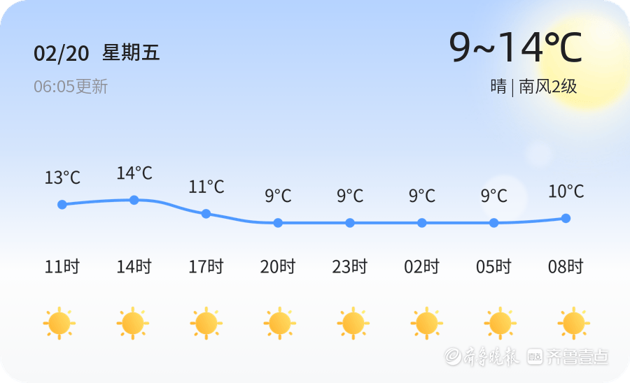 今天是2月20日,正月初四,星期五。威海市迎来晴朗的一天,全市各区均以晴朗天气为主,气温在9℃至14℃之间,南风2级,空气湿度为49%,PM2.5指数为78,空气质量良好。