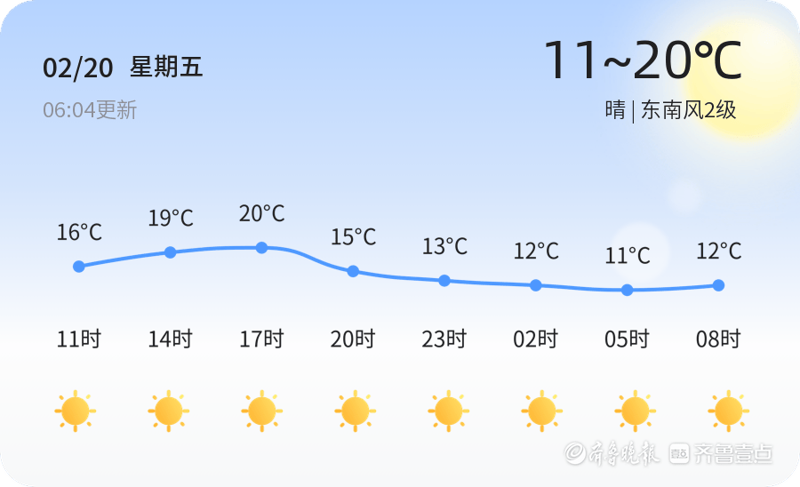 今天是2月20日,星期五,农历正月初四。济宁市今日天气晴朗,气温适宜,最高气温20℃,最低气温11℃,东南风2级,空气湿度83%。PM2.5浓度为83,属于良好水平。市民在外出时建议佩戴口罩,注意防晒和补水,以保持良好的健康状态。