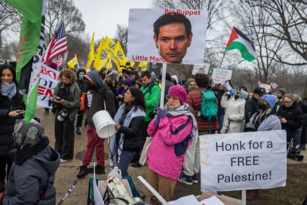 当地时间2026年2月19日,美国华盛顿特区,“和平委员会”首次领导人会议期间,抗议者在会议现场外举牌抗议。IC Photo