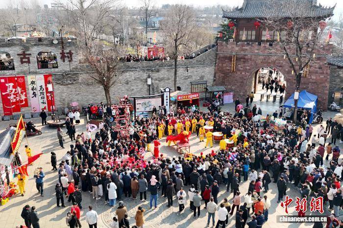2月17日,农历正月初一,被誉为“微短剧之村”河南登封袁桥古村吸引众多游客前来打卡体验。据了解,自2024年以来,已有超过50部微短剧在此取景拍摄。图为民俗表演吸引游客围观。(无人机照片) 刘杨迪 摄