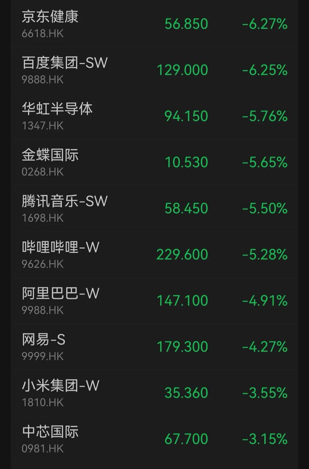 科网股多数下跌,百度集团跌超6%,金蝶国际、哔哩哔哩跌超5%,阿里巴巴跌4.91%,网易跌4.27%,小米集团、中芯国际跌超3%,美团跌1.58%,腾讯控股跌2.06%。